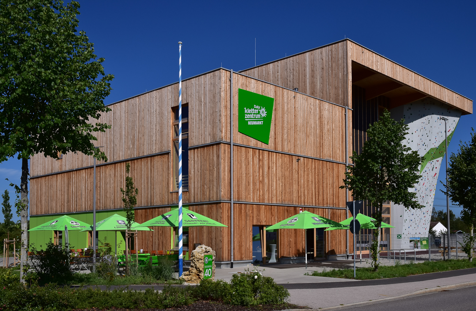 Dreigeschossige Sporthalle für künstliche Kletteranlagen mit Neben- und Büroräumen sowie Bistro in Holzbauweise.