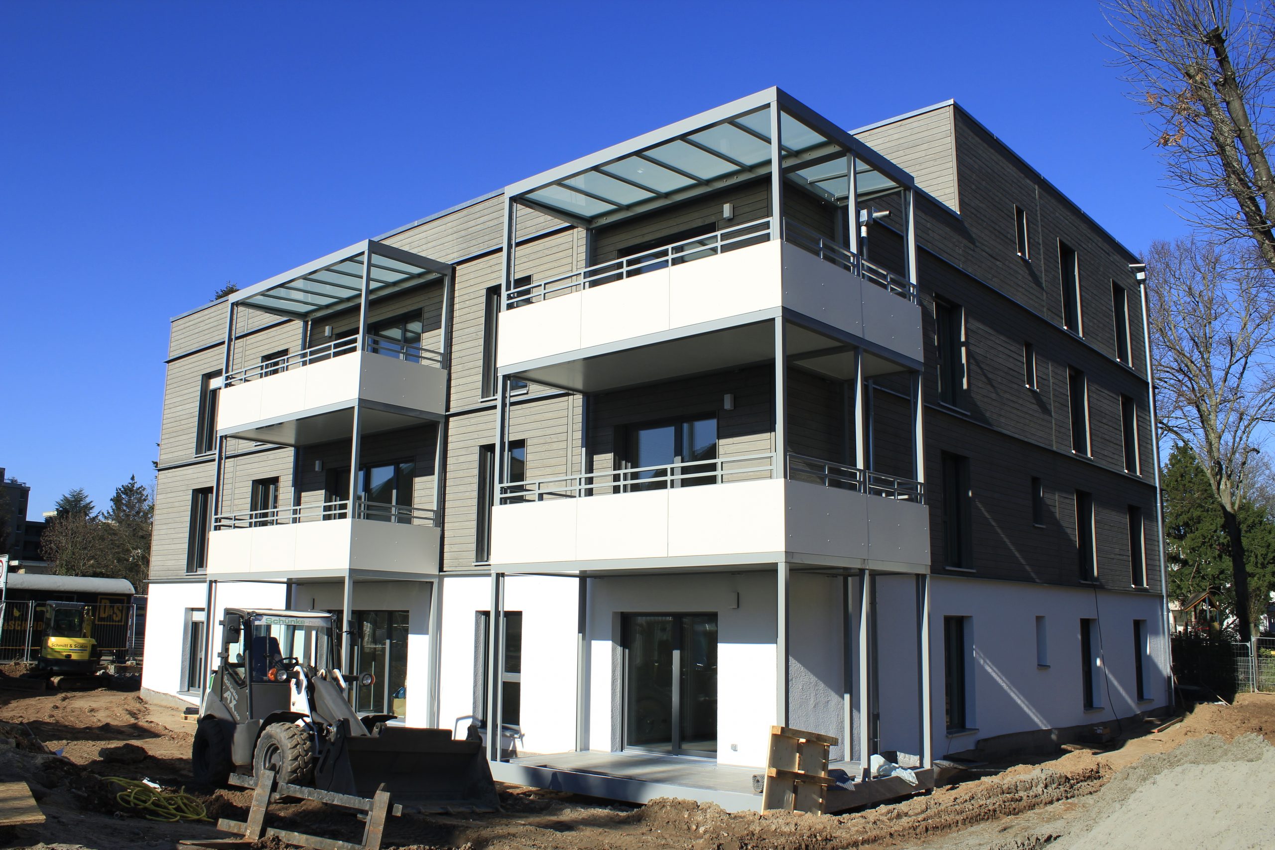 Viergeschossiges Gebäude mit Untergschoss und Gebäudekern in mineralischer Massivbauweise; Obergeschosse in Holzbauweise.